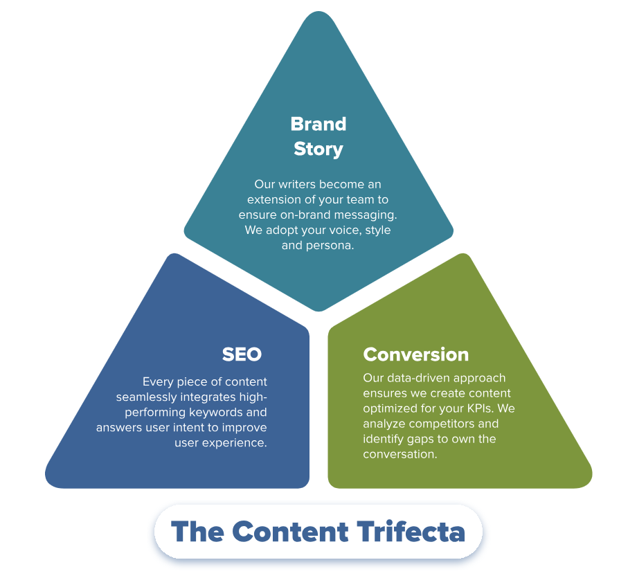 Our content writing services team offers content optimization solutions to improve your discoverability, engagement and conversions. Using proven SEO and conversion rate optimization (CRO) tactics, we’ll rework your titles, meta descriptions, on-page text, calls-to-action and more.